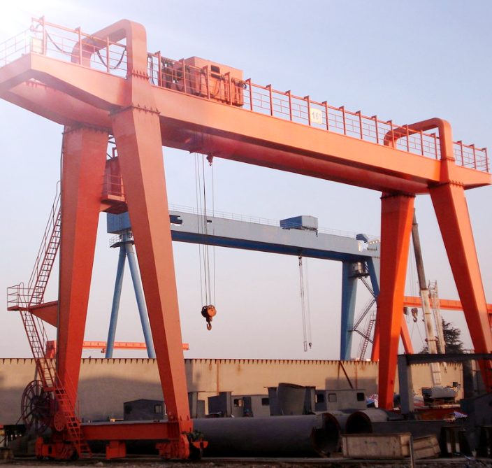 門式起重機(jī)(又稱龍門起重機(jī))是橋架通過兩側(cè)支腿支撐在地面軌道上的橋架型起重機(jī)。在結(jié)構(gòu)上由門架、大車運(yùn)行機(jī)構(gòu)、起重小車和電氣部分等組成。有的門式起重機(jī)只在一側(cè)有支腿,另一側(cè)支撐在廠房或棧橋上運(yùn)行,稱作半門式起重機(jī)。門式起重機(jī)的門架上部橋架(含主梁和端梁)、支腿、下橫梁等部分構(gòu)成。為了擴(kuò)大起重機(jī)作業(yè)范圍,主梁可以向一側(cè)或兩側(cè)伸出支腿以外,形成懸臂。也可采用帶臂架的起重小車,通過臂架的俯仰和旋轉(zhuǎn)擴(kuò)大起重機(jī)作業(yè)范圍。